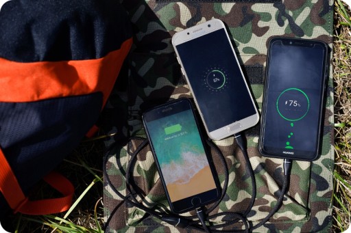 Podczas użytkowania maty w pełnym nasłonecznieniu byliśmy w stanie naładować aż 3 telefony jednocześnie* (używając kabla 3w1) w ciągu 20min naładowanie wzrosło o: