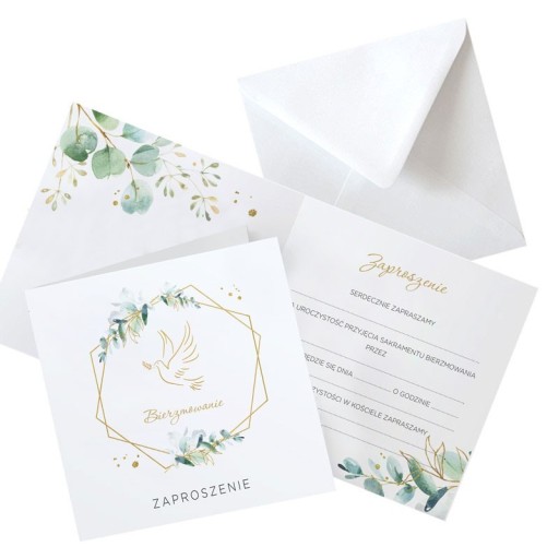 - skład: 10szt zaproszeń na Bierzmowanie do samodzielnego wypisywania z grafiką gołębia z gałązką w kolorach złota i gałązek eukaliptusa w odcieniach zieleni oraz 10szt dopasowanych białych kopert