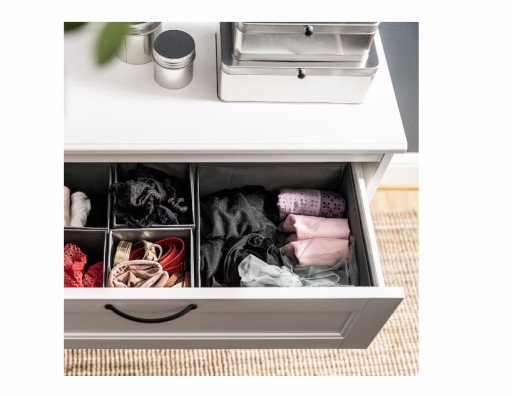 - Pomaga uporządkować skarpetki, paski czy biżuterię w szafie lub komodzie.