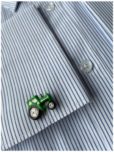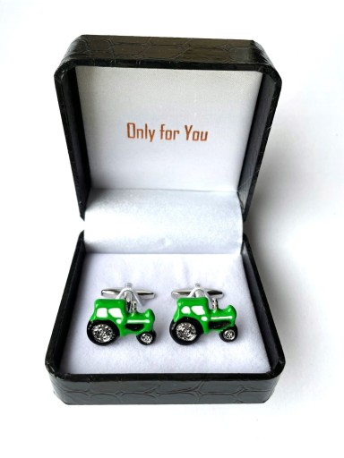 Bardzo ładne srebrne spinki do mankietów koszuli marki Exciting w kształcie traktorka, pomalowane farbami akrylowymi.