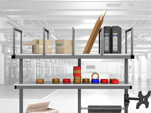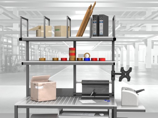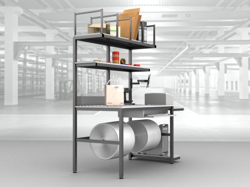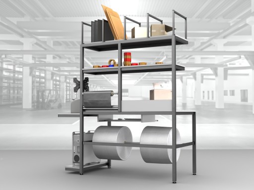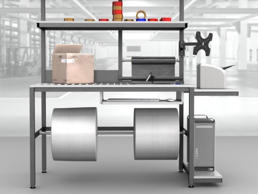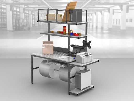 Wysokiej jakości stół warsztatowy do pakowania paczek wykonany z profili metalowych spawanych w stabilną bryłę.