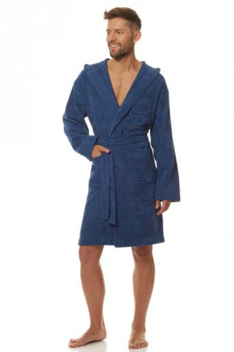 - Krótki szlafrok męski z kapturem, wiązany w pasie, z miękkiej dzianiny frotte.