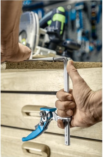 Ścisk dźwigniowy umożliwiający szybkie, punktowe mocowanie. Idealnie nadaje się do sklejania i mocowania różnego rodzaju materiałów czy elementów, np. w pracach stolarskich, ślusarskich oraz modelarskich. Wysoka siła docisku pozwala wyeliminować drgania podczas pracy. Doskonale pasuje do mocowania szyn prowadzących Festool, Makita, Metabo czy Milwaukee.