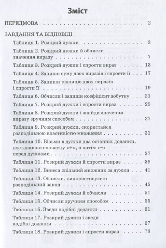 Посібник адресований учням 5-6-х класів, батькам та вчителям і призначений для формування та закріплення обчислювальних навичок, а також умінь і навичок застосування основних математичних понять, формул і правил з теми «Розкриття дужок. Подібні доданки». Видання відповідає чинній програмі з математики та може бути використане з будь-яким підручником.