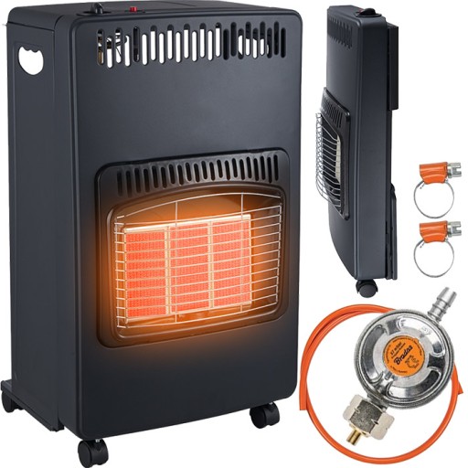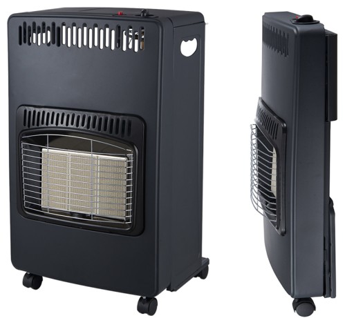 Po bokach obudowy wycięte zostały uchwyty, które ułatwiają przenoszenie piecyka w inne miejsce, a obrotowe kółka zapewnią mobilność urządzenia nawet z wsadzoną pełną butlą.