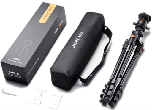 Zestaw zawiera: statyw firmy K&F, futerał ochronny z regulowanym paskiem, instrukcję obsługi oraz klucz imbusowy.
