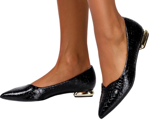 Czarne baleriny lakierowane na niskim ozdobnym obcasie ze skórzaną wkładką wzór wężowy Casu ER22WX1-B