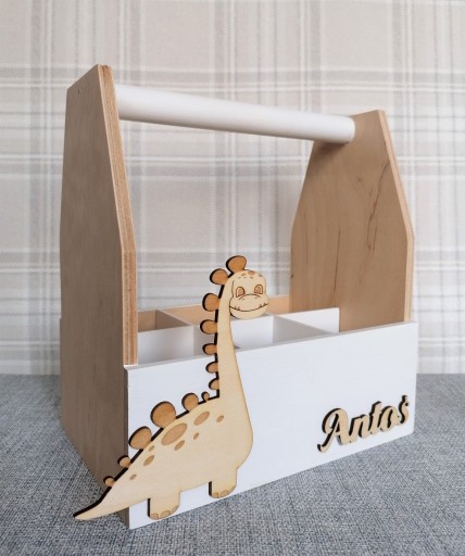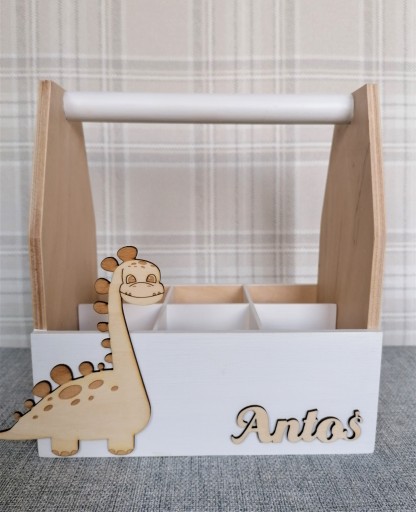 Przednie i tylne ścianki oraz uchwyt przybornika pomalowałyśmy na kolor biały natomiast boki zostawiłyśmy w naturalnym kolorze drewna. Tak dopasowana kompozycja kolorów prezentuję się bardzo efektowanie i stylowo. Dodatkową ozdobą jest przygotowany przez naszych plastyków dekor przedstawiający dinozaura.