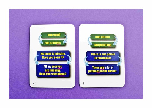 Tworzenie liczby mnogiej od większości rzeczowników jest z reguły proste, ale są pewne wyjątki. Zestaw skupia się na tych wyjątkach. Karty posiadają zadania na 2 poziomach trudności. Zadanie jest łatwe polega na podaniu liczby mnogiej od danego rzeczownika. Zadanie trudniejsze polega na przekształcaniu zdania z liczby pojedynczej na mnogą. Karty mogą służyć jako fiszki lub jako ekscytująca gra do nauki języka angielskiego.