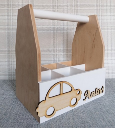 Przednie i tylne ścianki oraz uchwyt przybornika pomalowałyśmy na kolor biały natomiast boki zostawiłyśmy w naturalnym kolorze drewna. Tak dopasowana kompozycja kolorów prezentuję się bardzo efektowanie i stylowo. Dodatkową ozdobą jest przygotowany przez naszych plastyków dekor przedstawiający samochodzik.