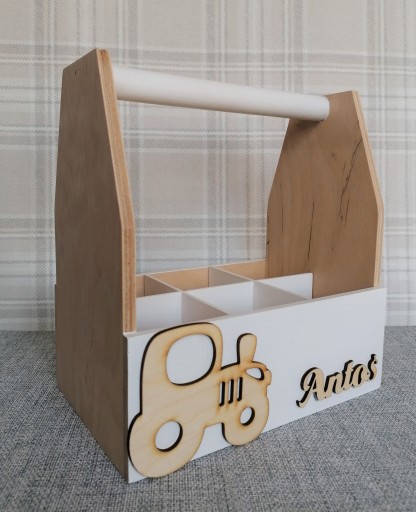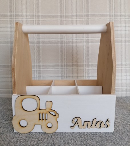 Przednie i tylne ścianki oraz uchwyt przybornika pomalowałyśmy na kolor biały natomiast boki zostawiłyśmy w naturalnym kolorze drewna. Tak dopasowana kompozycja kolorów prezentuję się bardzo efektowanie i stylowo. Dodatkową ozdobą jest przygotowany przez naszych plastyków dekor przedstawiający traktorek.