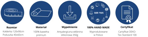 Komplet wykonany z najwyższej jakości bawełny premium, która zachowuje swoje właściwości nawet po wielu praniach. W środku wypełniony lekką, antyalergiczną włókniną silikonową 350g, przyszytą do środka, dzięki czemu nie przemieszcza się w trakcie użytkowania. Z jednej strony bawełna ze wzorem, z drugiej gładka.