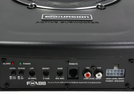 Subwoofer aktywny z serii Excursion Plug OEM umożliwiający rozbudowę fabrycznego systemu audio (OEM) w celu znacznej poprawy jakość brzmienia przy jednoczesnym zachowaniu pełnej funkcjonalności wnętrza samochodu. Subwoofer Excursion PXA-8B posiada bardzo solidną i wytrzymałą aluminiową obudowę odlewaną ciśnieniowo z podwójnym radiatorem, dzięki czemu konstrukcja charakteryzuje się wyjątkowo wysoką wydajnością mocową, nawet przy wyższych poziomach głośności. Wbudowany wzmacniacz mocy został wykonany w technologii SMD na dwustronnej płycie PCB i pracuje w bardzo efektywnej cyfrowej klasie D. Wzmacniacz posiada płynnie regulowany filtr Low Pass (LP), układ zmiany fazy sygnału, regulowany korektor niskich częstotliwości Bass Boost 0-12dB/45Hz oraz stopień wejściowy z możliwością wyboru poziomu sygnału Low/High (sygnał przesyłany z odtwarzacza kablami RCA lub pobierany bezpośrednio z głośników fabrycznych). Subwoofer Excursion PXA-8B posiada także układ "Auto Turn ON/OFF", umożliwiający automatyczne załączanie i wyłączanie wewnętrznego wzmacniacza w przypadku korzystania z wejść sygnałowych o poziomie głośnikowym (High Level). W komplecie znajduje się również zdalny przewodowy regulator umożliwiający sterowanie głośnością basu z fotela kierowcy.
