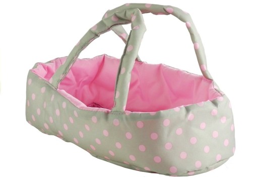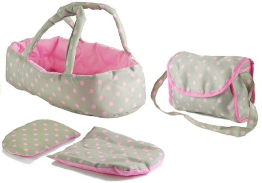 Dużym atutem jest dołączona do zestawu torba na rzep, a także materiałowy koszyk zamocowany w dolnej części stelaża wózka, umożliwiające przechowywanie gadżetów i akcesoriów do opieki nad zabawkowym bobasem. Na klasyczny wariant beżowego wózeczka składa się z wyciągane nosidełko z uszkami i składany daszek, chroniący lalkę przed słońcem. W środku nosidełka ukryto pasującą kolorystycznie pościel, składającą się z kołderki i poduszki, które sprawią, że lalka będzie podróżować w bardzo przyjemny i komfortowy sposób. Jeśli jednak dziewczynka będzie chciała, by jej zabawkowy bobas mógł spacerować w pozycji siedzącej, wystarczy wyciągnąć nosidełko, ustawić wybrany przez małą opiekunkę kąt nachylenia zagłówka i podnóżka, a następnie zabezpieczyć laleczkę pasami bezpieczeństwa. Zamiana klasycznego wózka w codzienną wersję jest błyskawiczna. Konstrukcja wózeczka do przewożenia lalek została wykonana z aluminiowych rurek w srebrnym kolorze. Materiał ten jest gwarancją wysokiej jakości i solidności zabawki, co w połączeniu z osadzeniem na czterech piankowo-gumowych kołach odpowiada za komfort jazdy i łatwość prowadzenia wózka.