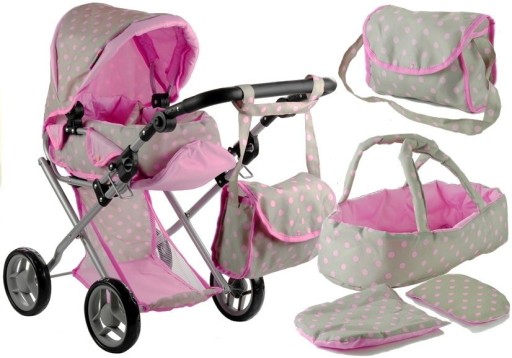 Jeżeli szukasz wózka do przewożenia lalek dla swojej kilkuletniej córeczki, mamy dla Ciebie podpowiedź — wybierz wózeczek z serii Alice. Dlaczego? Odznacza się on ogromem zalet i praktycznym zastosowaniem, a jego design mówi sam za siebie. Jasny, beżowy wózek ozdobiony różowymi groszkami jest wielofunkcyjną zabawką, którą w prosty sposób zamienisz z klasycznego wózka w jego wariant spacerowy. Podczas wyboru wózeczka do przewożenia lalek należy wziąć pod uwagę wzrost dziecka i przeznaczenie zabawki, dzięki czemu zabawa będzie komfortowa i możliwa we wszystkich warunkach — nie tylko w domu bądź sali zabaw. Prezentowany model posiada regulowaną rączkę, dzięki czemu wózeczek może rosnąć razem z dzieckiem, natomiast konstrukcja wykonana z wytrzymałych rurek aluminiowych oraz poszycie z impregnowanego tworzywa umożliwi przeniesienie zabawy poza dom. W zestawie znajduje się: