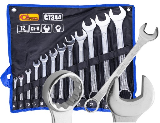 Zestaw 12 sztuk kluczy płasko-oczkowych w zakresie rozmiarów: 6–32 mm.