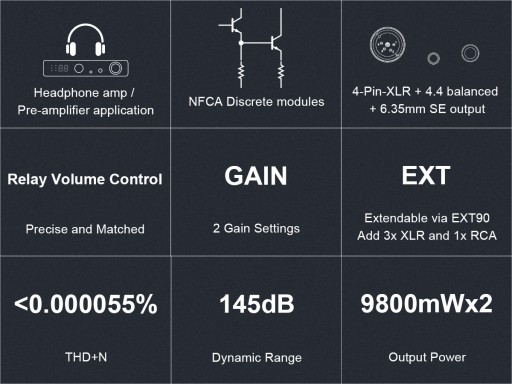 Topping A90 Discrete jest wyposażony w Nested Feedback Composite Amplifier (NFCA) oparty na wykorzystaniu komponentów dyskretnych. Każdy z czterech zintegrowanych dyskretnych modułów NFCA wykorzystuje 39 tranzystorów w zbalansowanej konstrukcji. Zoptymalizowana hybrydowa architektura sprzężenia zwrotnego napięcia/prądu oraz technologia Ultra High Gain Feedback (UHGF) zapewniają doskonałą wydajność DC i AC. Dzięki nowej konstrukcji, A90 Discrete korzysta z wysokiej mocy wyjściowej, dzięki czemu może bez wysiłku towarzyszyć zarówno słuchawkom o wysokiej czułości, jak i słuchawkom o wysokiej impedancji. Precyzyjnie dopasowane tranzystory o ultraniskim poziomie szumów połączone równolegle zapewniają wyjątkowo niski poziom szumów i zniekształceń.