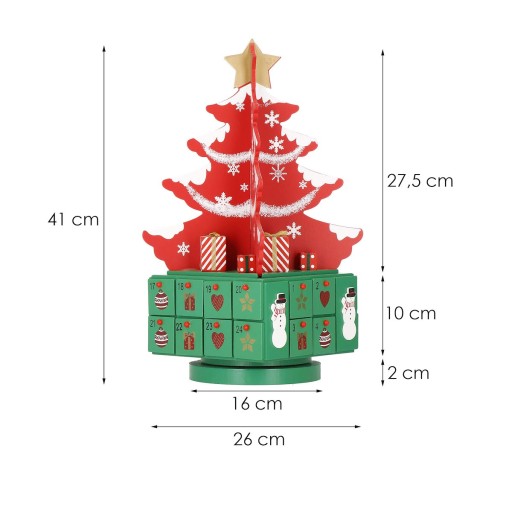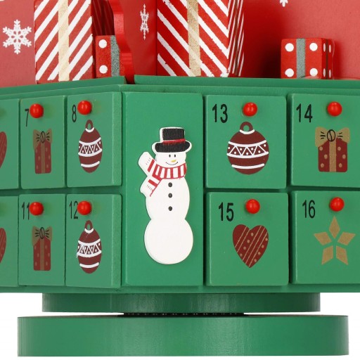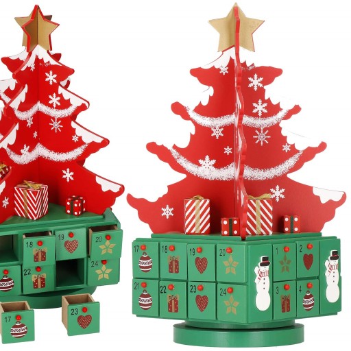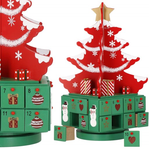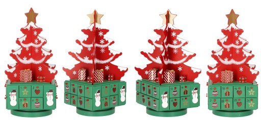 Na zielonej kasecie z dwudziestoma czterema szufladkami wspiera się wielopiętrowa ozdoba-choinka, która nada adwentowej zabawie świąteczny klimat.