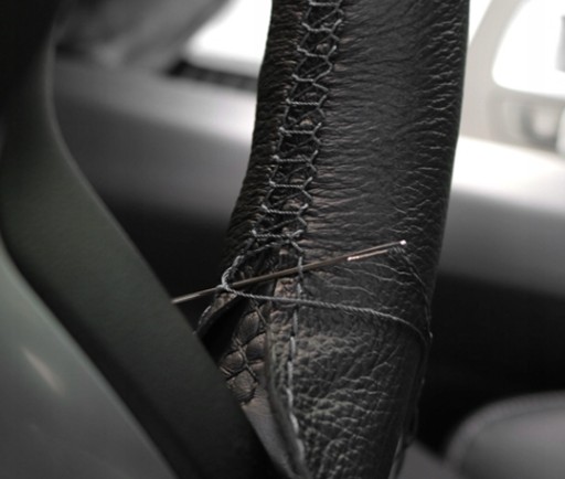 3. Obszywamy kierownicę, przeplatając nitkę przez co drugi ścieg, wykonując ruchy w kształcie litery S. Należy pamiętać, że zahaczamy tylko o nitkę, nie dziurawiąc skóry.