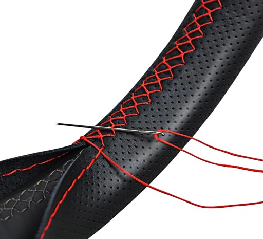 1. Nałożyć pokrowiec na kierownice w taki sposób aby łączenie skóry, znalazło się na dole i na środku kierownicy. Pokrowiec obszywamy od ramienia do ramienia, na początku należy odmierzyć odpowiednią długość załączonej do zestawu nitki. Mniej więcej jest to dwa razy tyle ile ma odcinek do obszycia, czyli od ramienia do ramienia.
