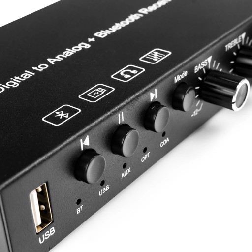 Wbudowany wysokowydajny układ DAC, obsługuje częstotliwość próbkowania 32 ~ 192 K/24bit. Pokrętło regulacji głośności umożliwia jednoczesną regulację głośności gniazda słuchawkowego oraz interfejsu RCA. Pełni również funkcję włącznika. Dodatkowo urządzenie obsługuje wzmocnienie słuchawek 16-300Ω. Wzmacniacz działa również dla połączenia Bluetooth.