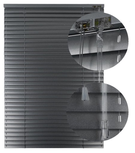 Standardowo żaluzja wykonywana jest z prowadzeniem bocznym żyłkowym, co pozwala trzymać ją blisko szyby. Dzięki temu, żaluzja nie wisi w powietrzu podczas uchylania okna. Jeżeli żaluzja ma nie mieć prowadzenia żyłkowego prosimy o poinformowanie nas przy składaniu zamówienia.