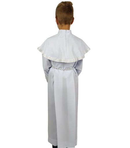 Rękawy i pelerynka obszyte są srebrną pasmanterią. Do alby dołączamy dopasowany do obszyć sznur, który podkreśla liturgiczny charakter szaty.