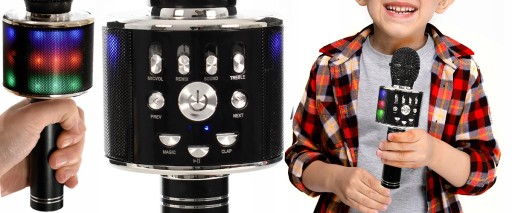 Dzięki temu gadżetowi maluchy oraz dorośli mogą wcielać się w gwiazdy muzyki, śpiewać ulubine piosenki, a także urządzać konkursy karaoke. Ta zabawka da wiele radosnych chwil w trakcie zabawy i będzie sprzyjać rozwijaniu pasji. Jeden mikrofon a wiele możliwości. Świeci do rytmu muzyki światłem LED posiada tryb DMX oraz modulator głosu, który zapewni dawkę śmiechu. Gadżet wyposażony został wbudowany głośnik dwustronny, na przedniej stronie ma menu, dzięki któremu możemy operować funcjami mikrofonu. Posiada przełączniki i suwaki, które dają możliwość przełączania utworów, robić pauzę, regulować poziom głośności, włączyć tryb radia, modulować swój głos w różnych trybach. Posiada tryb wygranych oklasków.