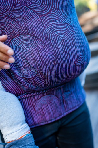 Zatrzaski regulujące wysokość kołnierza są ozdobą nosidełka i dodają mu uroku. Do regulacji długości pasów naramiennych wykorzystaliśmy taśmę regulacyjną i delikatne magnesy, które mają utrzymać tkaninę na odpowiednim miejscu gdy nosimy dziecko na plecach. Natomiast pas biodrowy i znajdująca się na nim regulacja szerokości panelu jest totalną innowacją, której nie znajdziecie nigdzie indziej. Dzięki wykorzystaniu opasek na taśmie regulacyjnej przede wszystkim możemy bardzo precyzyjnie wyregulować nosidełko, a dodatkowo panel przepięknie i bardzo estetycznie układa się w zakładki.