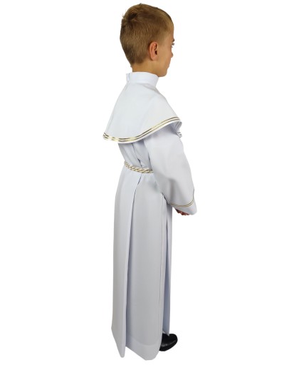 Rękawy i pelerynka obszyte są złotą pasmanterią. Do alby dołączamy dopasowany do obszyć sznur, który podkreśla liturgiczny charakter szaty.