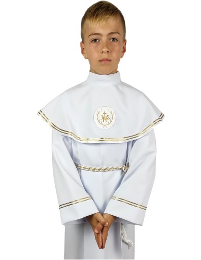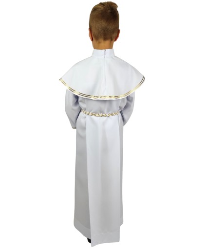 Rękawy i pelerynka obszyte są złotą pasmanterią. Do alby dołączamy dopasowany do obszyć sznur, który podkreśla liturgiczny charakter szaty.