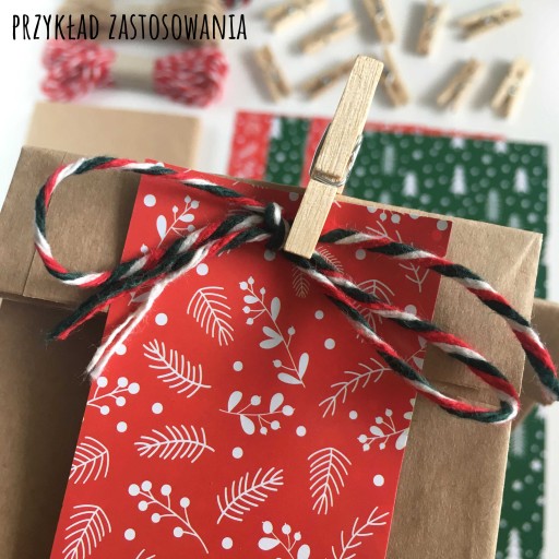 10 arkuszy papieru ozdobnego o wymiarach ok. 9x19,7 cm z dwustronnym nadrukiem - z jednej strony czerwony we wzorki, z drugiej zielony w choinki