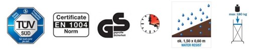 - ✅Atestowane przez TÜV, nośność 200 kg/m², obciążenie do 180 kg (obciążenie powierzchni) zgodne z nową normą PN EN 1004-01, grupa rusztowań 3