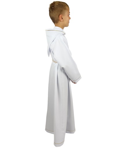 Nieskazitelnie biała alba o prostym, trapezowym kroju to podstawowy strój do Pierwszej Komunii Świętej. Kaptur dodaje chłopięcego charakteru.