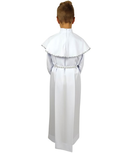 Rękawy i pelerynka obszyte są srebrną pasmanterią. Do alby dołączamy dopasowany do obszyć sznur, który podkreśla liturgiczny charakter szaty.