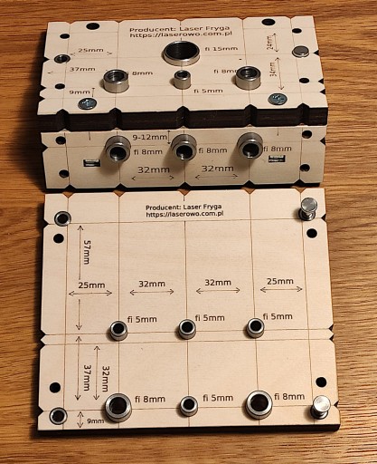 Zbudowany ze sklejki o grubości 12mm, dzięki temu szablon jest lekki a tulejki w nim osadzone nie wysuwają się w przypadku intensywnej pracy która powoduje ich nagrzewanie. Jest to dużą zaletą w stosunku do szablonów wykonanych z tworzyw sztucznych.