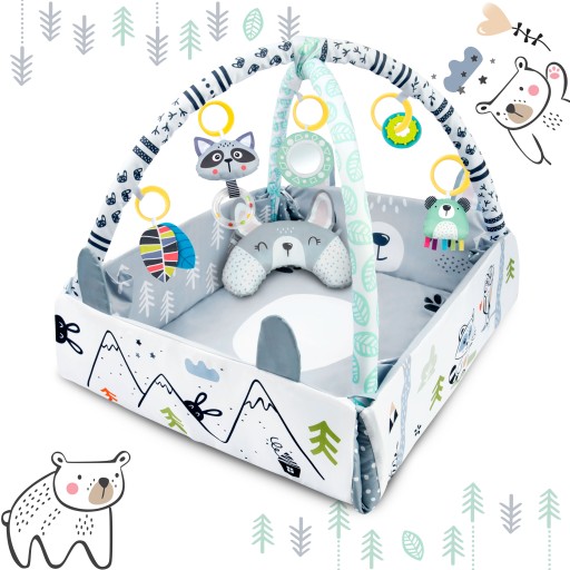 - zestaw zawiera: matę, 4 ścianki, 2 pałąki, 7 wielofunkcyjnych zabawek, poduszkę,