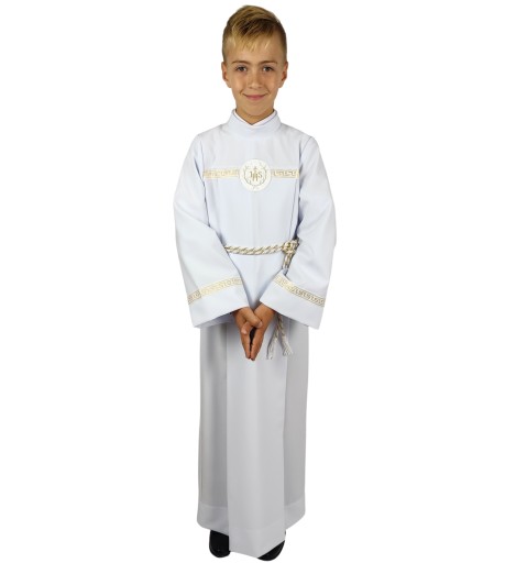 Rękawy i karczek obszyte są złotą pasmanterią. Do alby dołączamy dopasowany do obszyć sznur, który podkreśla liturgiczny charakter szaty.