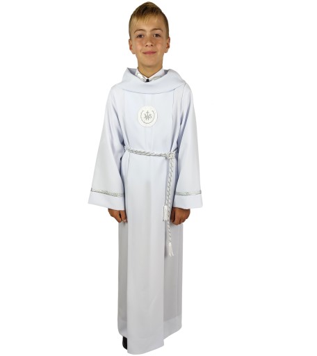Nieskazitelnie biała alba z szalem imitującym kaptur to typowy strój dla chłopca do Pierwszej Komunii Świętej.