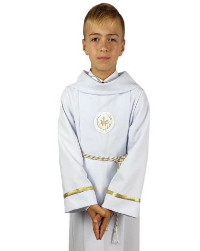 Nieskazitelnie biała alba z szalem imitującym kaptur to typowy strój dla chłopca do Pierwszej Komunii Świętej.