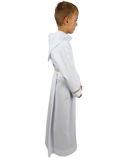 Nieskazitelnie biała alba z szalem imitującym kaptur to typowy strój dla chłopca do Pierwszej Komunii Świętej.