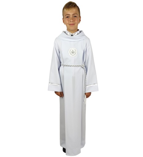 Nieskazitelnie biała alba z szalem imitującym kaptur to typowy strój dla chłopca do Pierwszej Komunii Świętej.