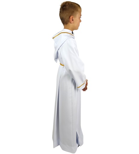 Nieskazitelnie biała alba z kapturem to typowy strój dla chłopca do Pierwszej Komunii Świętej.