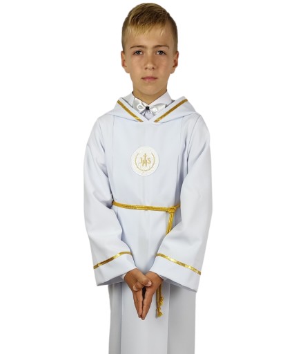 Nieskazitelnie biała alba z kapturem to typowy strój dla chłopca do Pierwszej Komunii Świętej.