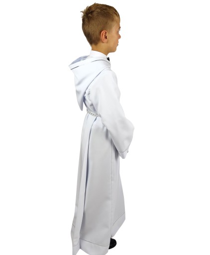 Nieskazitelnie biała alba z kapturem to typowy strój dla chłopca do Pierwszej Komunii Świętej.
