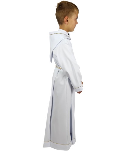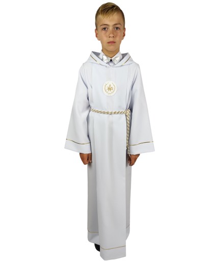 Nieskazitelnie biała alba z kapturem to typowy strój dla chłopca do Pierwszej Komunii Świętej.