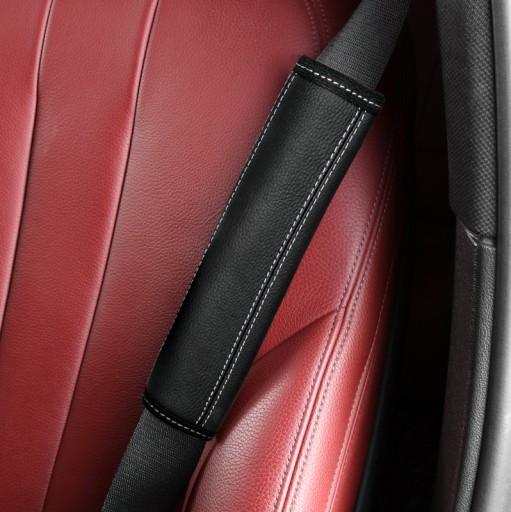Nakładki wykonane są z eleganckiego materiału typu EKO SKÓRA, przeszyte mocnymi nićmi tapicerskimi a na ich brzegach znajduje się lamówka. Wypełnione są miękką warstwą gąbki poprawiając komfort podróżowania sprawiając, że pas nie wbija się w ciało.