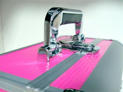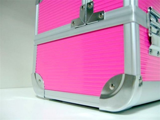 Kuferek CM 002 wykonany jest z różowego materiału wykończony srebrnymi narożnikami po bokach. Dzięki temu kufer jest bardziej odporny na uszkodzenia.