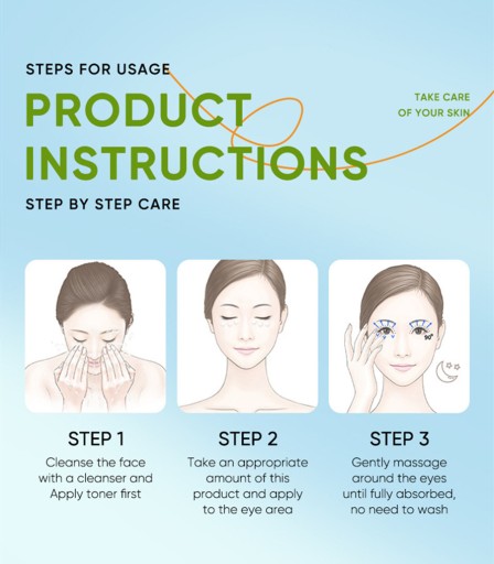 Zastosowanie: Po oczyszczeniu skóry twarzy należy wziąć odpowiednią ilość kremu do oczu i masować skórę oczu okrągiem przez 3-5 minut.