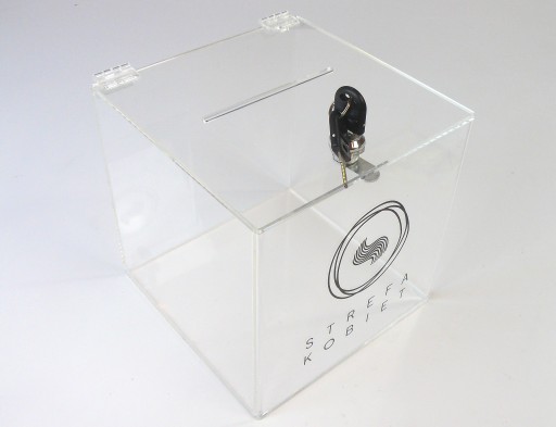 Skrzynki idealnie sprawdzą się przy zbiórce pieniędzy na cele charytatywne, można je także wykorzystać do ankiet czy głosowania. Wieko urny mocowane jest na dwóch bezbarwnych zawiasach z plexi oraz wyposażone jest w zamek, do którego dołączone są dwa kluczyki, co zapewnia dyskrecję i bezpieczeństwo.